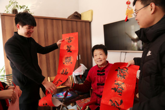 来到行动不便的贫困户家中,一副副饱满真情的春联送到村民手中,新春的祝福送到村民心中,对联虽小,情意浓浓,老师同学们与村民唠家常、聊新春、拜早年。