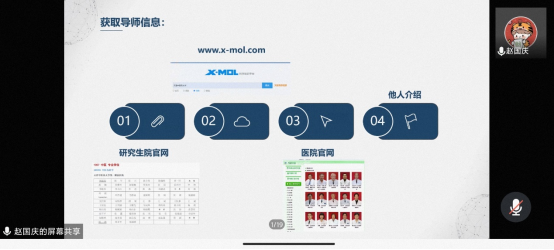 其次是成功考入一二附院学长学姐们,首先是一附院中医儿科学的李景轩学长。他将自己的分享分为自我介绍、复试流程、随便聊聊三个模块,特别提醒面对老师不要冷场,做简历时务必真实,然后是二附院中医内科的李爽学长。他从自身的复试经历出发,表示心态很重要、英语要重视;提到若要找导师,最好去医院,不建议发邮件;如果对自己要求较高,最好找科主任。接着是二附院针灸推拿专硕的张楚懿学姐。就如何准备得细致,她井井有条地罗列出三大考题方向,包括中医方面、诊断和英语,并细致入微地给出需要背诵的知识点,全是满满的干货。之后是一附院中医内科学的赵国庆学长。同样做了精美的PPT,他从复试内容、找导师两大方面做了分享。他说:“复试就像一个信息站,谁找到的信息多,谁的优势越大。” 除了细致讲述了复试时专业综合素质的5道大题和外语听力与口语 2道题,他还根据自己的经历,道出找导师的避雷指南。