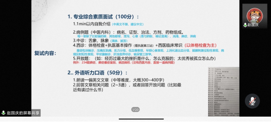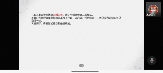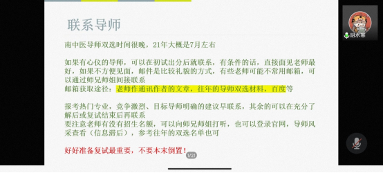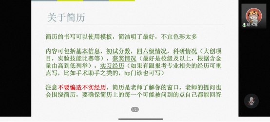 首位分享的是南京中医药大学在读研究生胡水寒学姐。在精心准备的PPT上,她从复试时间和信息收集途径、南中医报录比例、临床复试内容、复习建议、复试前准备、考场经验等方面进行了详细的叙述。其中重点讲了网络复试的3道题目,即外语、操作考核和专业问题及综合素质的考核,并以自己抽到的题为例,给出对应的建议。胡学姐在PPT上用不同颜色的字体和荧光标记以及小括号展示了复试的全面流程和注意事项,可谓十分之详尽。