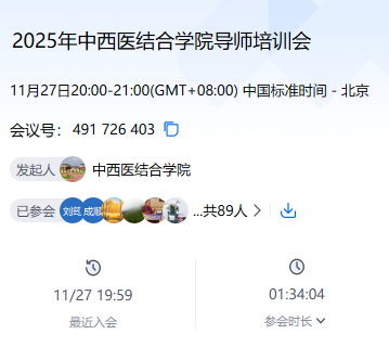 为全面贯彻落实研究生导师立德树人的根本任务,进一步夯实导师队伍建设根基,提升研究生培养质量,2025年11月28日晚,中西医结合学院(临床医学院)采用线上腾讯会议的形式组织召开了2025年度导师培训会。边育红院长、章明星副院长及导师近90人参加了此次会议,研究生学院马佐英副院长、郭华星老师莅临指导本次培训会。