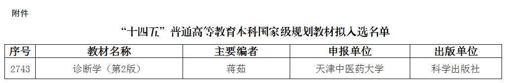 2026年1月19日,教育部发布《关于“十四五”普通高等教育本科国家级规划教材拟入选名单的公示》,学院蒋茹教授主编的《诊断学(第2版)》成功入选,为“十四五”期间学院本科教材建设取得的最高荣誉,也是我校唯一一部入选的国家级规划教材,是我校在教材建设领域取得的又一重要突破。